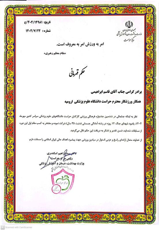 به پاس قدردانی از رشادتهای قاسم ابراهیمی همکار حفاظت فیزیکی شبکه بهداشت و درمان اشنویه در کسب مقام اول رشته آمادگی جسمانی ادارات کل کشور که چندی پیش در خزرآباد مازندران برگزار شد، حکم قهرمانی، تندیس یادبود و کارت هدیه رئیس مرکز حراست وزارت بهداشت درمان و آموزش پزشکی توسط مدیر شبکه و مسئول حراست شبکه تحویل همکار قاسم ابراهیمی گردید.